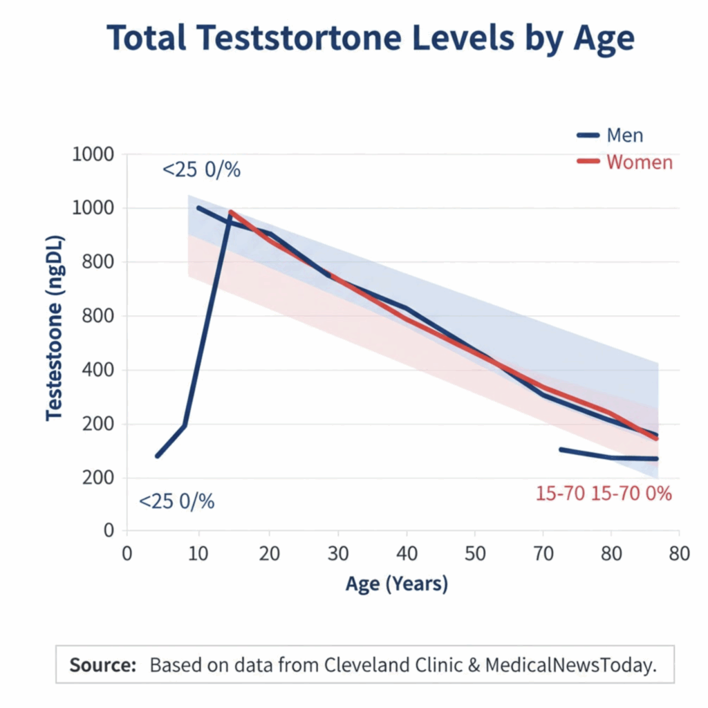 🧬 1. Introduction: The Role of Testosterone in the Body When we hear the word “testosterone,” most people immediately imagine muscular men, aggression, and an unstoppable libido. In reality, this steroid hormone is a much more complex and subtle regulator. Rightly called the “king of hormones,” testosterone plays a crucial role not only in forming the male phenotype (body and facial hair, deep voice, muscle development) but also in maintaining overall health and well-being in both men and women. It affects bone density, mood, cognitive function, metabolism, energy levels, and even sleep quality. Simply put, a healthy testosterone level is synonymous with vitality, energy, and, if you will, zest for life. 📜 2. The History of Testosterone Research The story of testosterone is a fascinating journey from primitive medical observations to modern biochemical synthesis. Even Hippocrates and Aristotle pondered the causes of aging and the loss of male strength. But the true scientific breakthrough came in 1849, when German physiologist Adolf Berthold demonstrated that transplanting testes into a castrated rooster restored its “male” traits. This was, in fact, the first—albeit accidental—experiment in hormone replacement therapy! In 1935, the “golden age of steroid chemistry” began. Three independent research teams successfully isolated and synthesized pure crystalline testosterone. Leopold Ruzicka and Adolf Butenandt, who later received the Nobel Prize for their work, opened the era of androgens, paving the way for therapeutic treatments to correct hormonal deficiencies. 🧪 3. How Testosterone Is Produced The production of testosterone is a highly complex process orchestrated by what’s known as the hypothalamic–pituitary–gonadal axis (HPGA). It all begins in the hypothalamus, which signals the pituitary gland to release luteinizing hormone (LH) and follicle-stimulating hormone (FSH). LH travels to the testes (in men) and stimulates Leydig cells to synthesize testosterone from cholesterol. In women, testosterone is produced in the ovaries and adrenal cortex, but in much smaller amounts. It’s important to remember that testosterone levels fluctuate throughout the day: they peak in the early morning (around 7–10 AM) and gradually decline by evening. That’s why blood tests for testosterone must be taken in the morning. 📉 4. Causes of Low Testosterone Many people assume that low testosterone is a problem exclusively for older men. In reality, this issue is becoming increasingly common among younger men as well. Age is, of course, a primary factor, as testosterone naturally begins to decline by about 1–2% per year after the age of 30. However, modern lifestyle adds a number of other contributing factors: Chronic stress and high cortisol levels. Obesity (especially visceral fat, the so-called “beer belly”). Fat tissue contains the enzyme aromatase, which actively converts testosterone into estrogen. Lack of sleep. Sleeping less than 7 hours dramatically suppresses hormone synthesis. Chronic illnesses (diabetes, hypertension, thyroid disorders). Certain medications (e.g., opioids, glucocorticoids). Alcohol abuse and smoking. In my experience, low testosterone is most often caused not solely by aging, but by a combination of excess weight and persistent stress. ⚠️ 5. Symptoms of Testosterone Deficiency Testosterone deficiency does not always appear suddenly, like a hammer blow. Often, symptoms accumulate gradually, and people simply attribute them to “aging” or “fatigue.” Common and characteristic signs include: Reduced libido and erectile dysfunction. Often the first warning that prompts men to seek help. Persistent fatigue. Constant low energy. Mood changes: irritability, apathy, depressive states. Physical changes: loss of muscle mass, increase in fat (especially around the abdomen and hips), decreased strength. Cognitive issues: “brain fog,” difficulty concentrating, and memory lapses. 🧾 6. Diagnosis: What Tests to Take If you notice similar symptoms, the first step is to consult a qualified endocrinologist or andrologist and get proper blood tests. Avoid self-diagnosis based solely on symptoms. Key diagnostic tests include: Total Testosterone (TT): measures overall hormone levels. Must be taken in the morning (before 10 AM) on an empty stomach. Sex Hormone Binding Globulin (SHBG): a protein that binds testosterone, rendering it inactive. Free Testosterone (FT): the biologically active portion. Often calculated as the Free Testosterone Index (FTI). Luteinizing Hormone (LH) and Follicle-Stimulating Hormone (FSH): assess pituitary function (to distinguish primary vs. secondary hypogonadism). Estradiol (E2): testosterone is aromatized into estrogen; monitoring balance is crucial. Prolactin and Complete Blood Count (CBC): to rule out other causes. If the first test shows low testosterone, it is usually repeated 1–2 times for confirmation. 🧠 7. How to Interpret the Results Getting tested is only half the battle. Understanding the results is often more challenging, as being within the lab’s “reference range” does not automatically mean you are fine. Lab ranges are typically very wide (e.g., 8–35 nmol/L). For example, a 45-year-old man with a level of 10 nmol/L is technically “normal,” but may feel terrible, as this is borderline for his age. Experienced doctors focus less on the general range and more on optimal values for a specific age, and, importantly, on hormone ratios. For example, high SHBG can “steal” free testosterone, making it low even if total testosterone is mid-range. LH and FSH are also key: Low LH/FSH with low testosterone → problem in the pituitary (secondary hypogonadism). High LH/FSH with low testosterone → problem in the testes (primary hypogonadism) 💉 8. What is Testosterone Replacement Therapy (TRT) Testosterone Replacement Therapy (TRT) is a medical procedure aimed at restoring physiologica